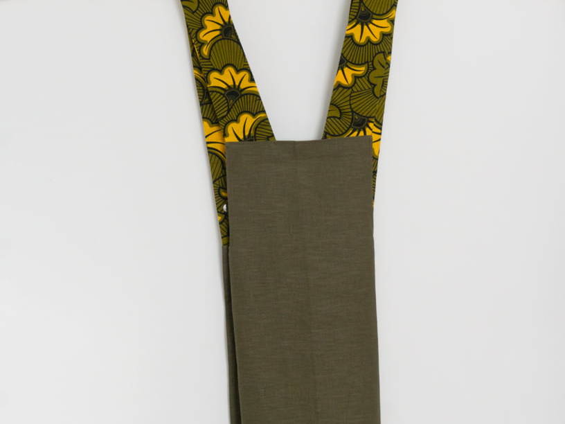 | Face avant | Poches et bretelle en wax, le reste en lin |