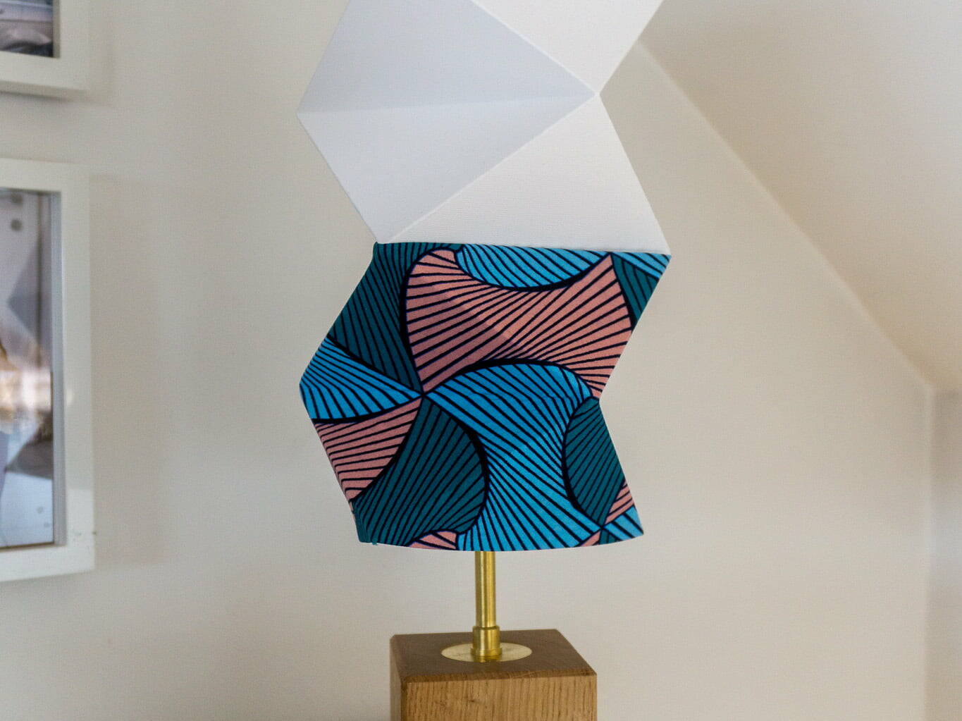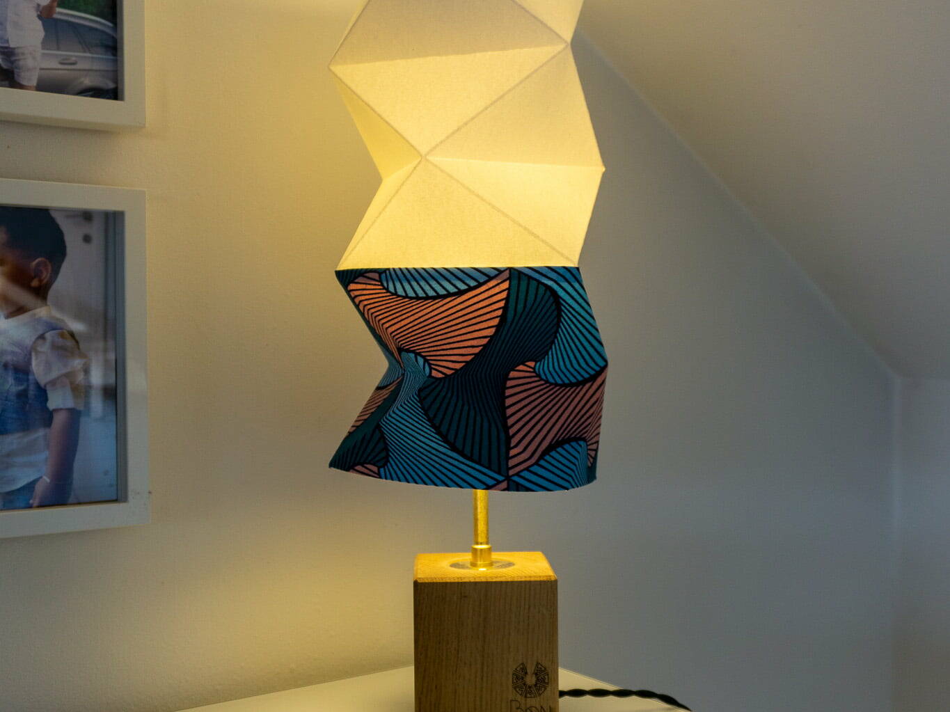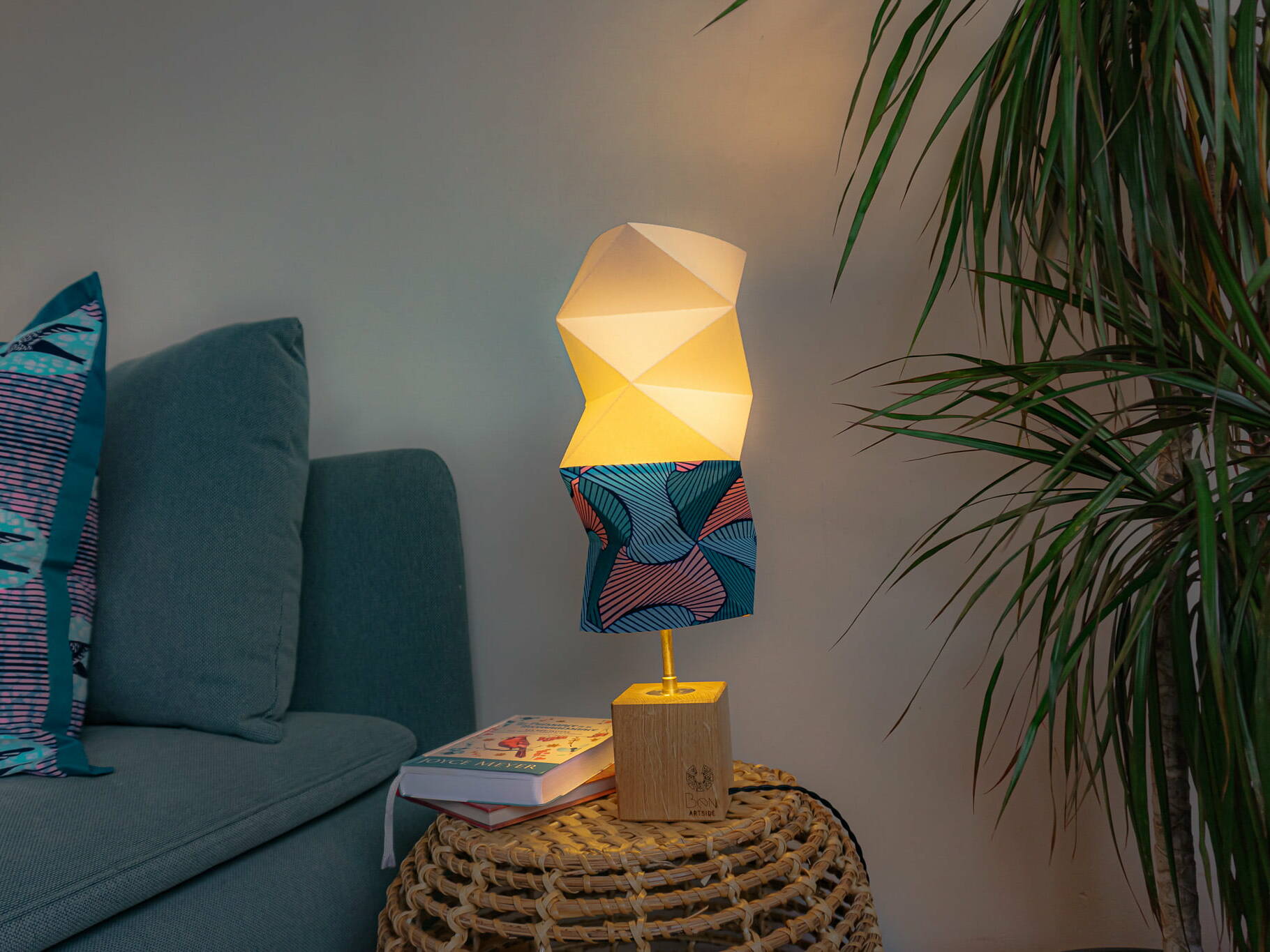 This origami lamp is the perfect accessory for your home. Made from sturdy paper, fabric scraps, and recycled wood, it is lightweight and easy to move around. The folded origami shape adds a unique and colorful touch to your interior decor. With its warm and soft light, Kama will be ideal as a bedside lamp, reading lamp, or even for creating a cozy ambiance in the living room